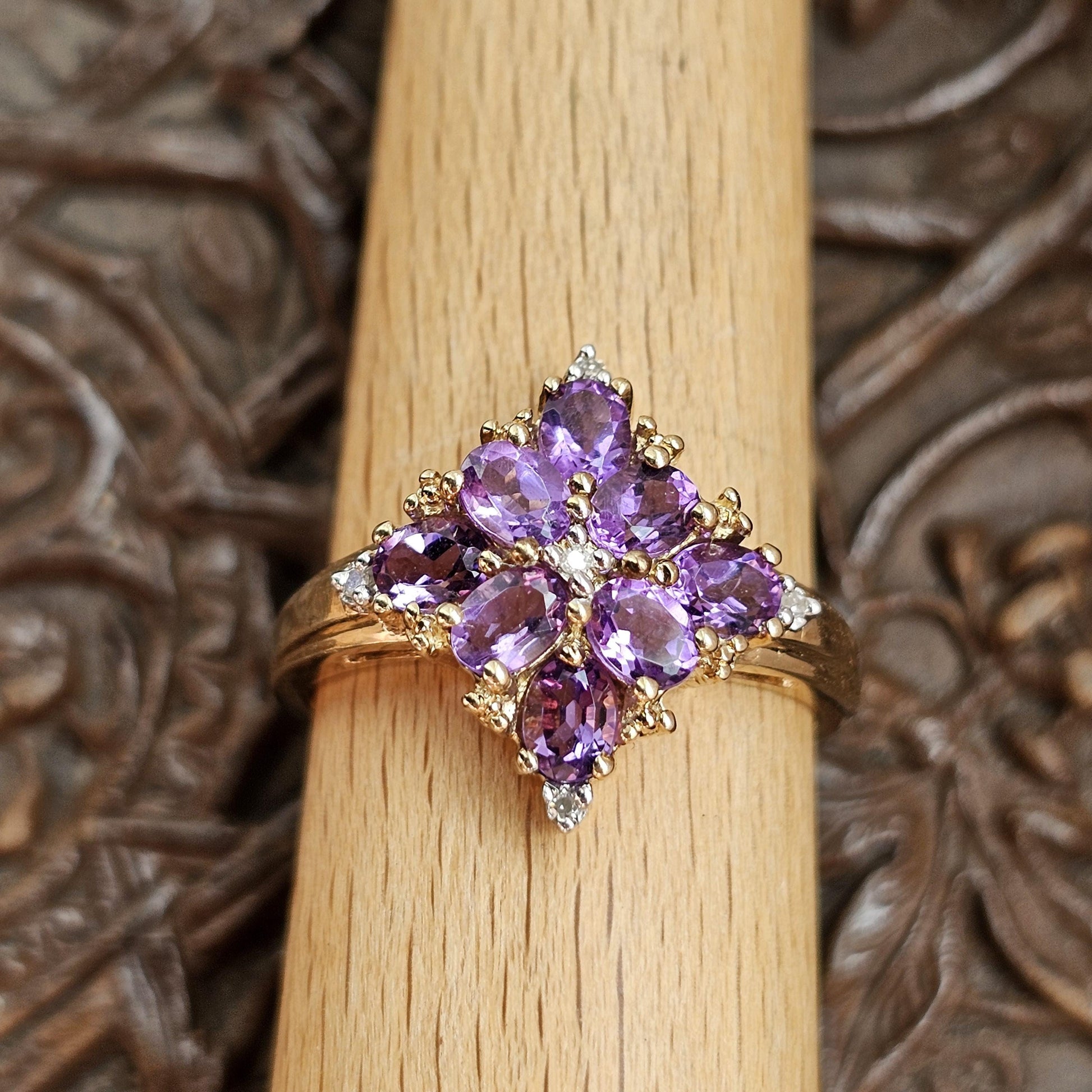 Hallmarked 9ct yellow gold ring with a lively cluster of purple amethysts and small diamond accents. The stones are claw set in a cross-shaped arrangement that reads as a floral/starburst on the hand, with a polished split shoulder leading to a slim, comfortable band.