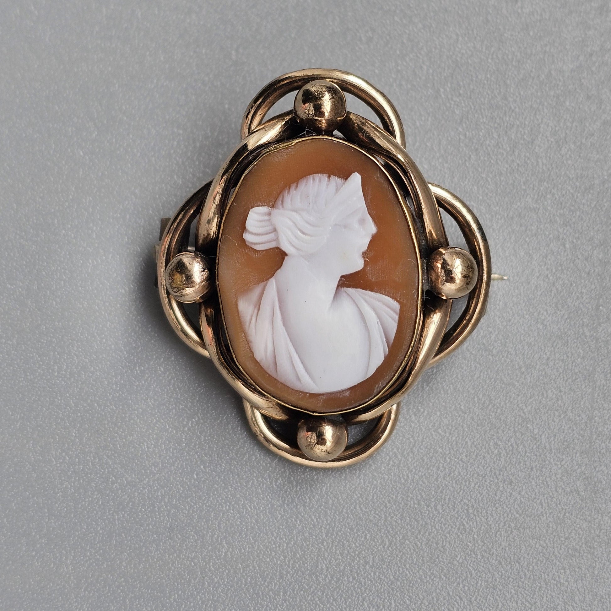 A petite Victorian cameo brooch, finely carved from shell to depict a classical female profile. The warm peach and cream tones of the shell are framed in a looping gilded pinchbeck mount, accented with smooth ball details at the compass points. Measuring 3cm by 2.5cm, it secures with an old-style pin and C-clasp typical of the period.