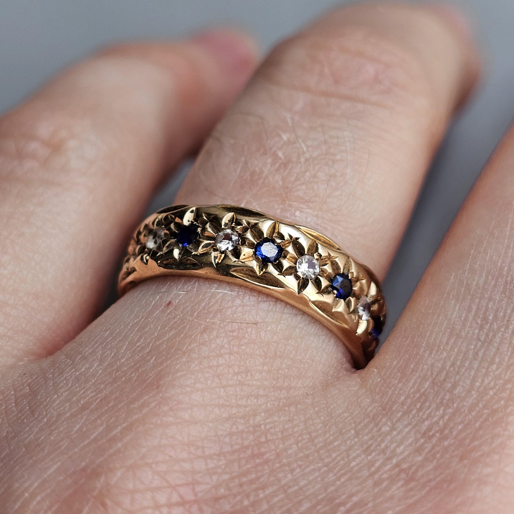 A striking vintage 1970s eternity-style band in 9ct yellow gold, set with alternating blue spinel and rock crystal stones in engraved starburst settings. The rich blue of the spinel contrasts beautifully with the icy sparkle of the rock crystal, while the detailed star cuts give the surface depth and texture.
