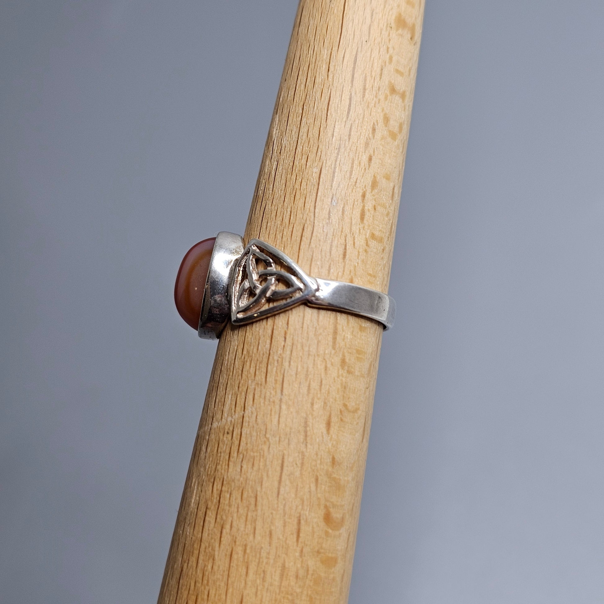 Charming vintage silver ring featuring a warm banded carnelian agate cabochon in a beautiful Celtic-inspired band.